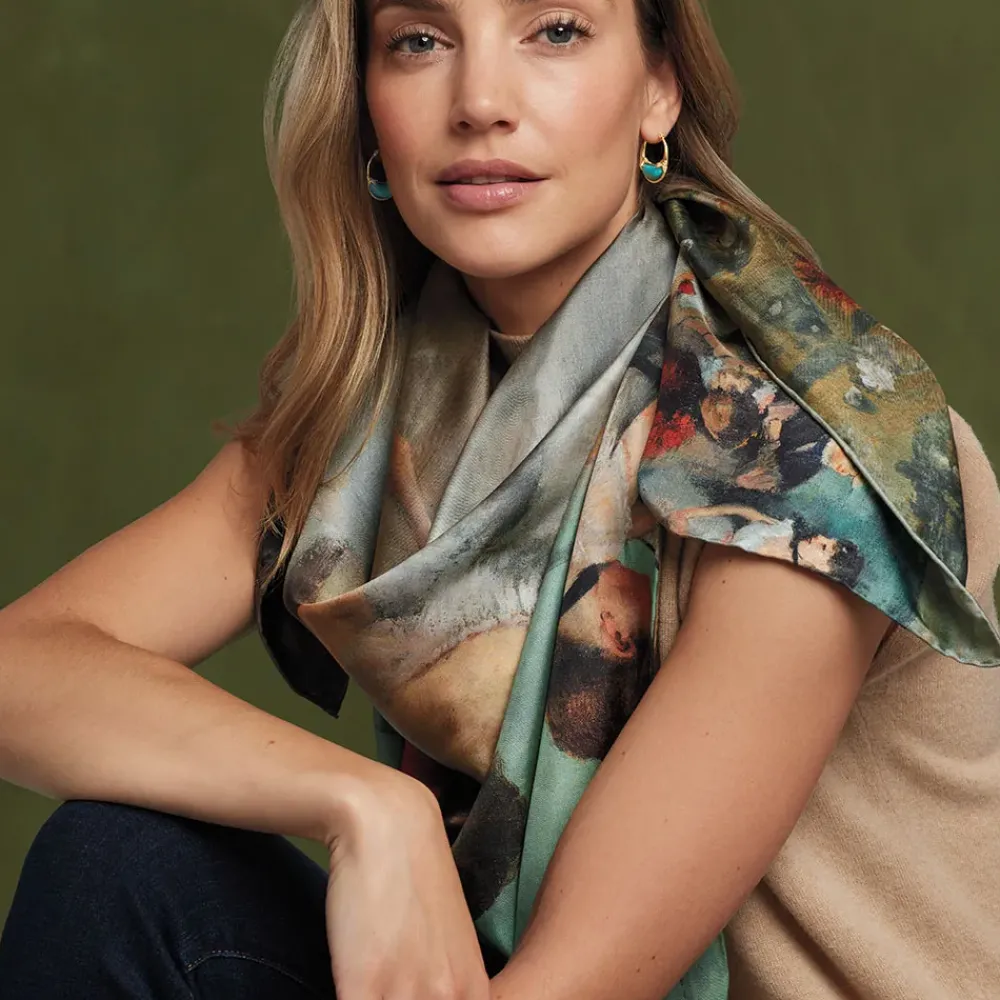 This Striking Double-Sided Scarf Reproduces Two Vibrant Oil Paintings By Edgar Degas (French, 1834–1917) In The Met Collection. A Woman Seated Beside A Vase Of Flowers (1865) Depicts A Lady—Probably The Wife Of Degas’S Childhood Friend Paul Valpinçon—Lost In Thought Beside A Bursting Bouquet. The Unusual Composition Exemplifies The Artist’S Endeavor To Capture His Subjects In Fleeting, Slice-Of-Life Moments. The Reverse Side Of The Scarf Features One Of Degas’S Favorite Subjects. The Dance Class (1874) Pictures Ballerinas And Their Mothers Waiting As A Dancer Executes An Attitude For Her Examination By The Ballet Master Jules Perrot.